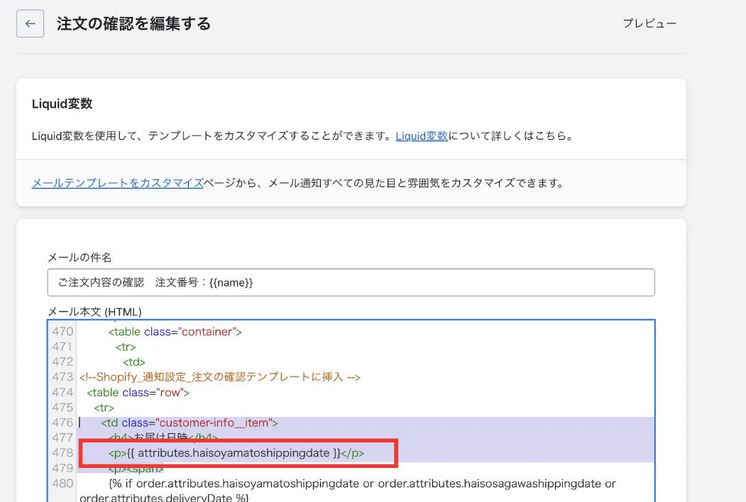 Shopifyの設定>通知からテンプレートの編集ができます。その中に<p>{{ attributes.haisoyamatoshippingdate}}{{attributes.haisoyamatoshippingtime}}</p>を入れるとメールに配送日時を表示させることができます。