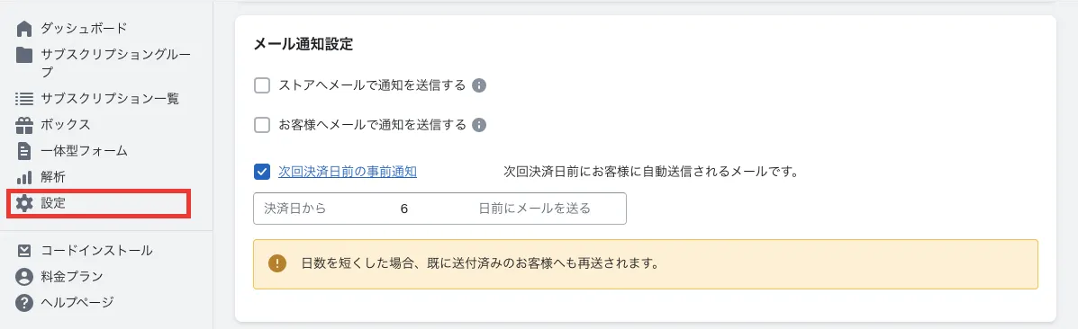 アプリ画面上の「設定」にてストア・お客様にそれぞれメールを送るか否かを設定可能です