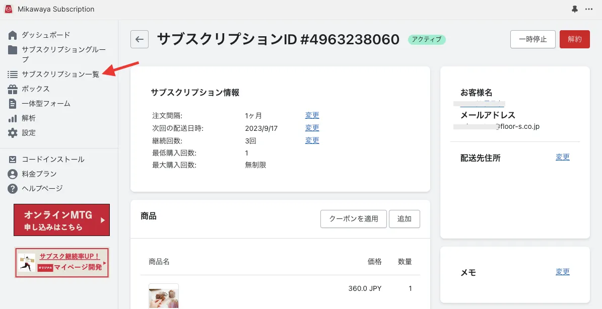 【手順①】 通知メールのサブスクリプションIDをクリックし、該当のお客様を確認する