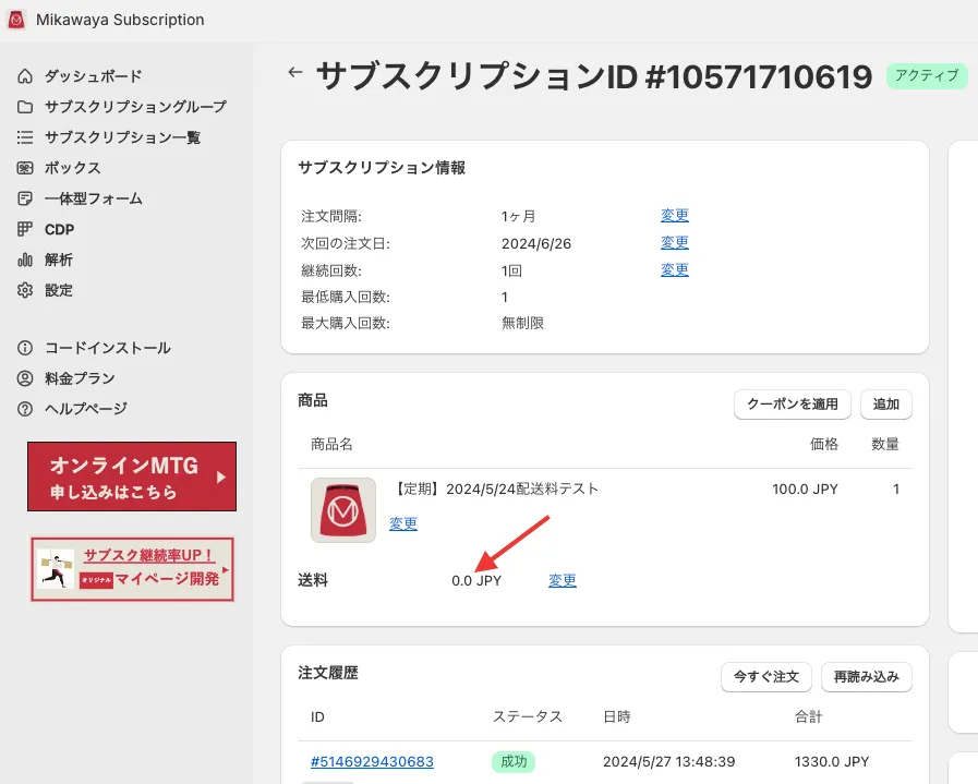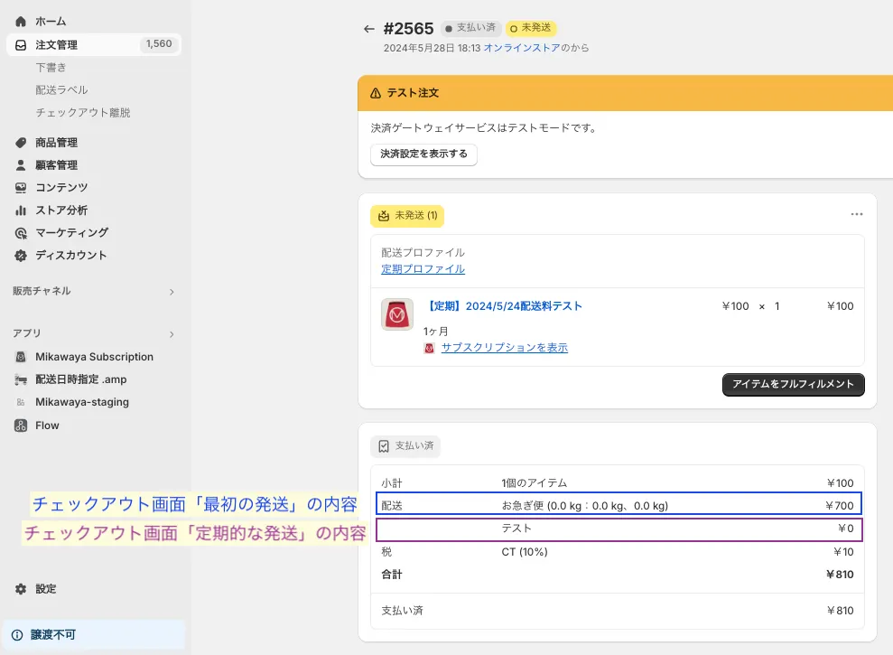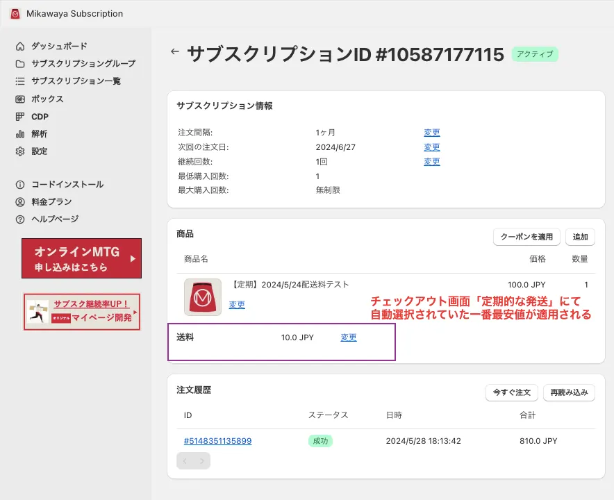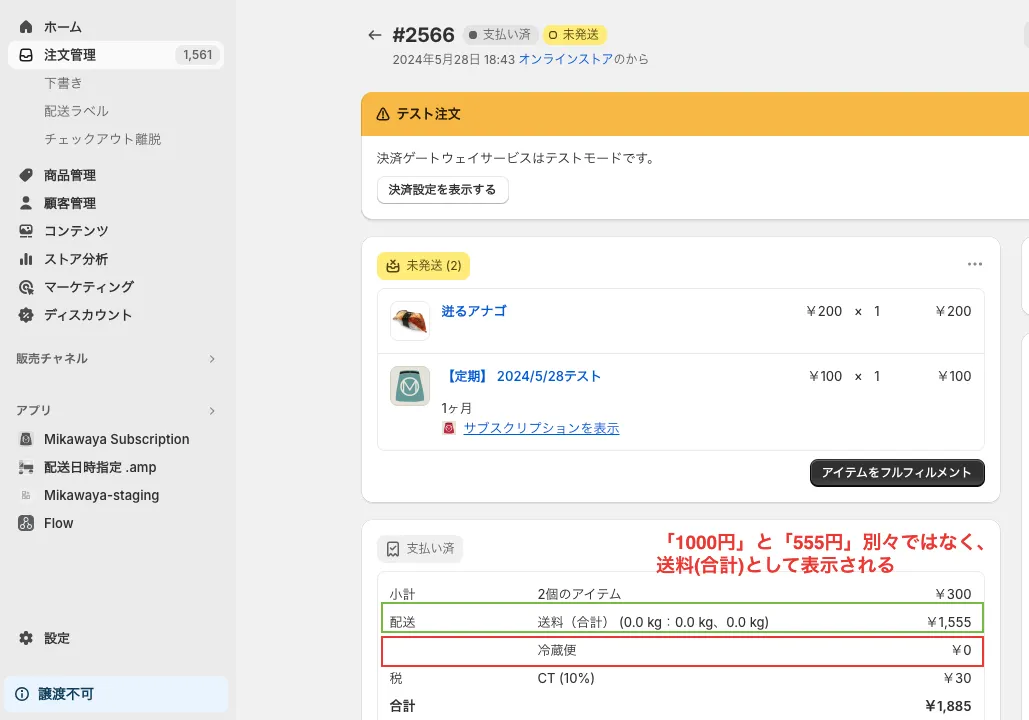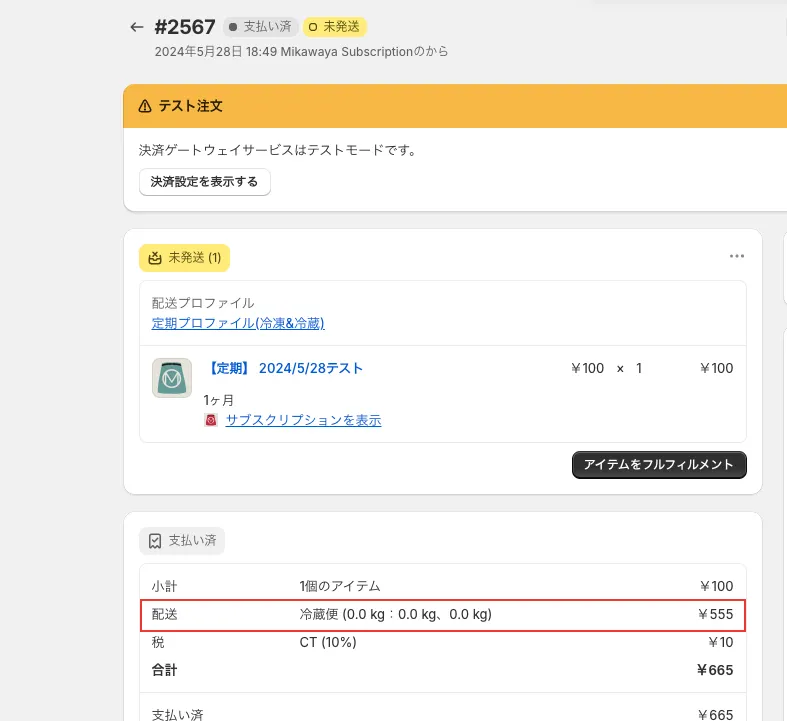が1つのカートに含まれている場合、Shopify設定>配送と配達で設定している「カスタム配送料」が毎月の定期的な発送に適用されるか調査しました。