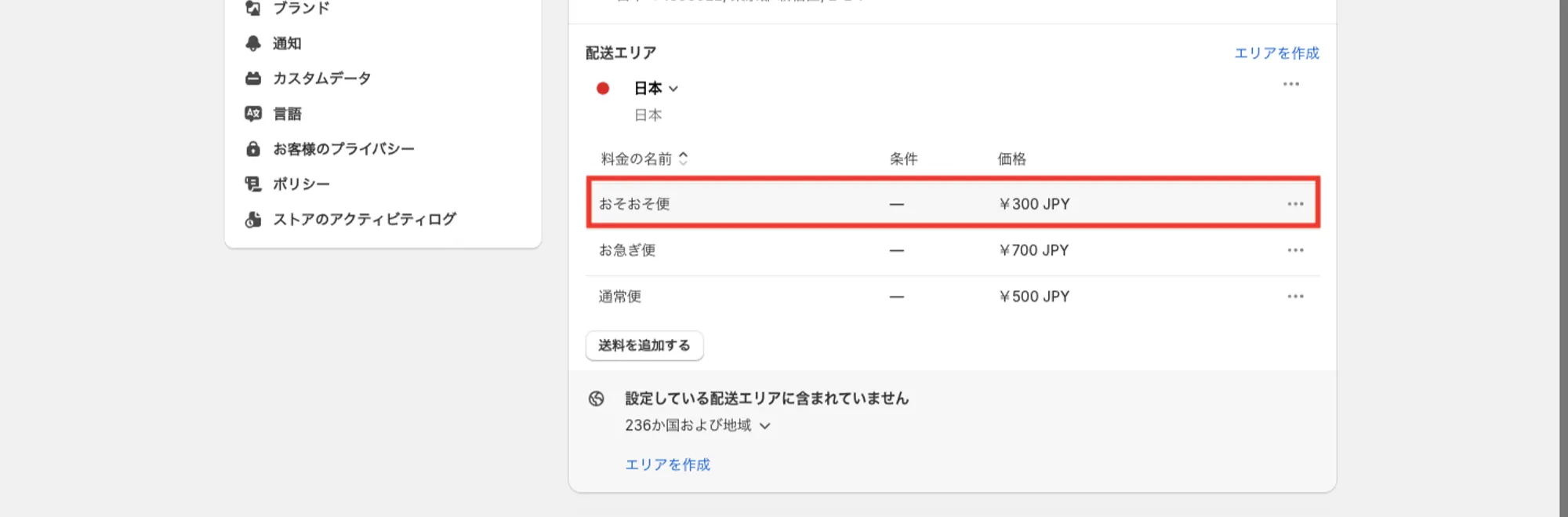 Shopify設定>配送と配達>カスタム配送料で、定期商品に対し、2つの送料を設定しました。