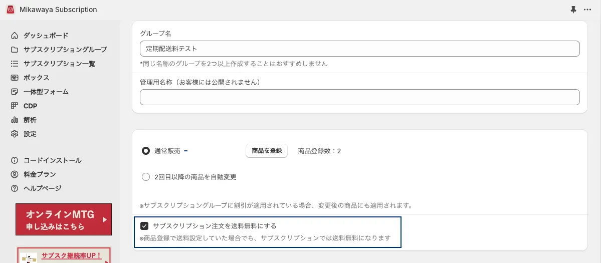 ②定期商品には、「カスタム配送料」で設定している内容が定期便2回目以降も継続されます。
