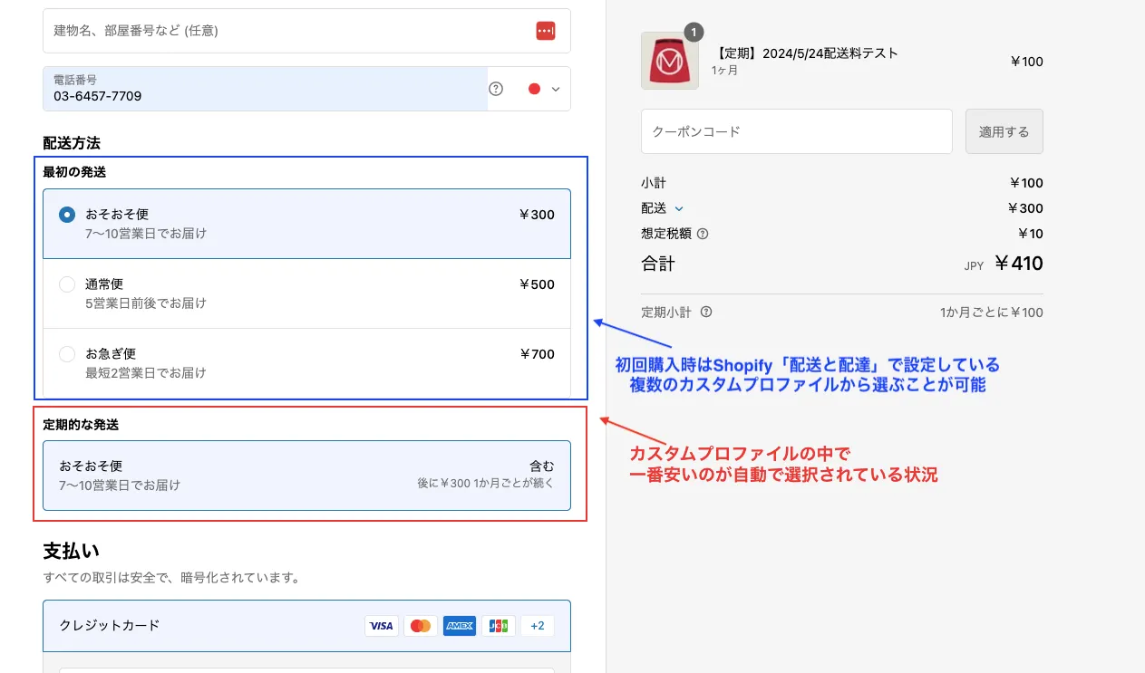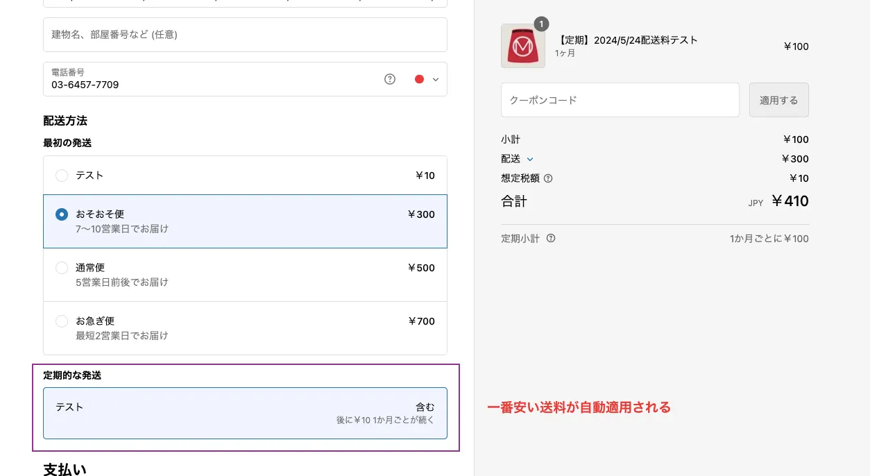Shopifyチェックアウト画面の「定期的な発送」は「おそおそ便 300円」から最安値である「テスト 10円」に自動で切り替わりました。