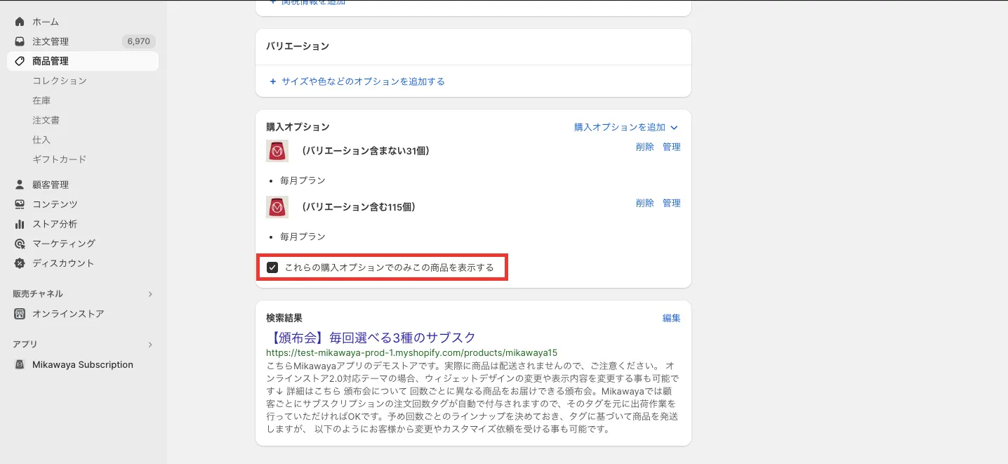 商品ページで通常ボタンを非表示にし、定期ボタンのみでの販売を行う場合は、Shopifyの商品管理より「これらの購入オプションでのみこの商品を表示する」にチェックを入れて頂ければ定期ボタンのみの販売に変更可能となります。
