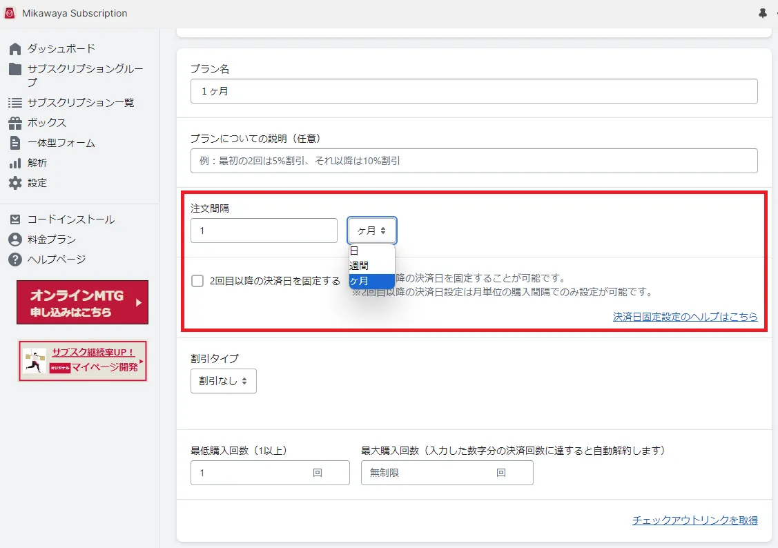 有料会員のサービス内容によっては1年間で自動的に販売終了といったように、規定の購入回数に達した場合は自動的に定期契約を解約処理することも可能です。