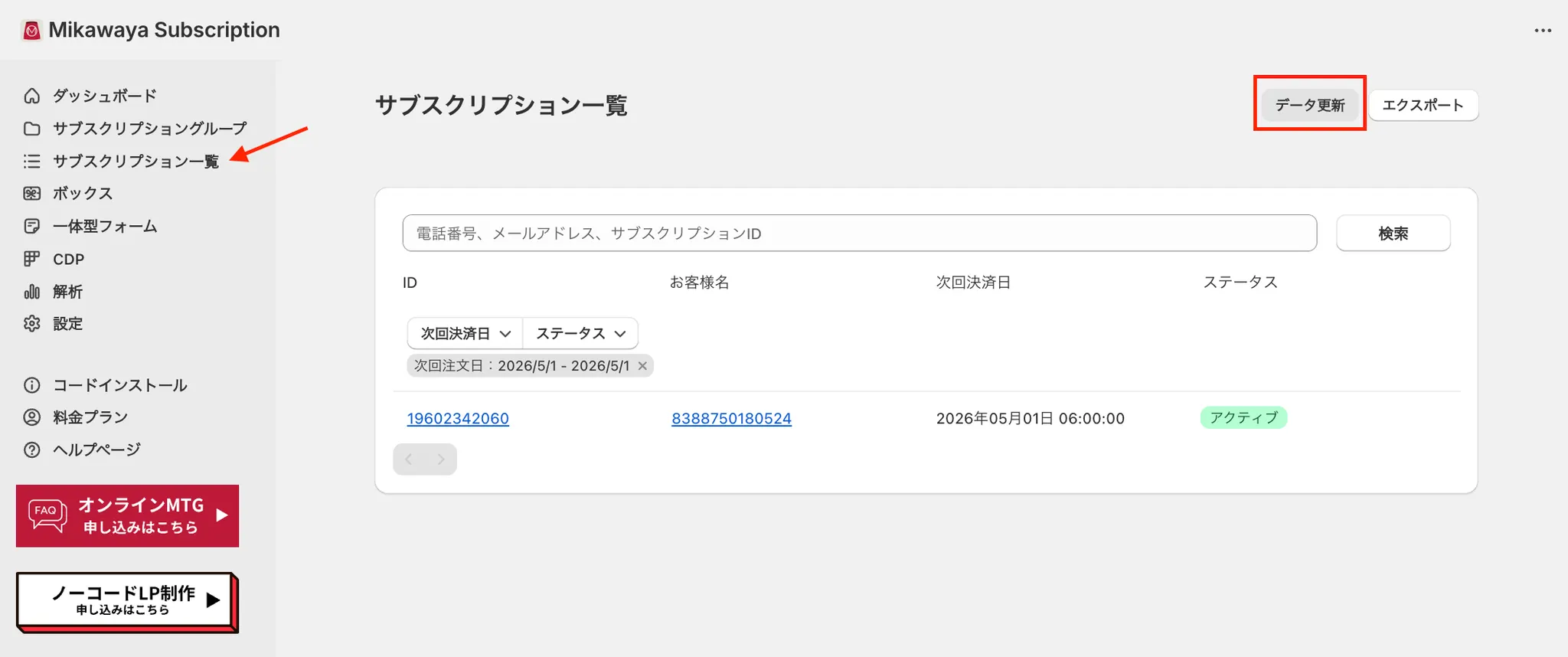Mikawayaアプリ管理画面>サブスクリプション一覧>「データ更新」をクリックします。