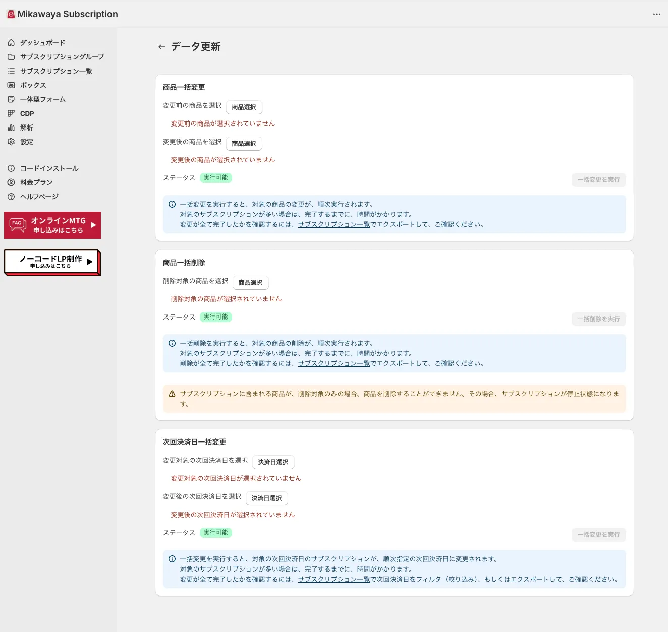 本機能をご活用いただくことによって、ストア様側で商品の変更/削除、次回決済日を一括変更できるようになります。