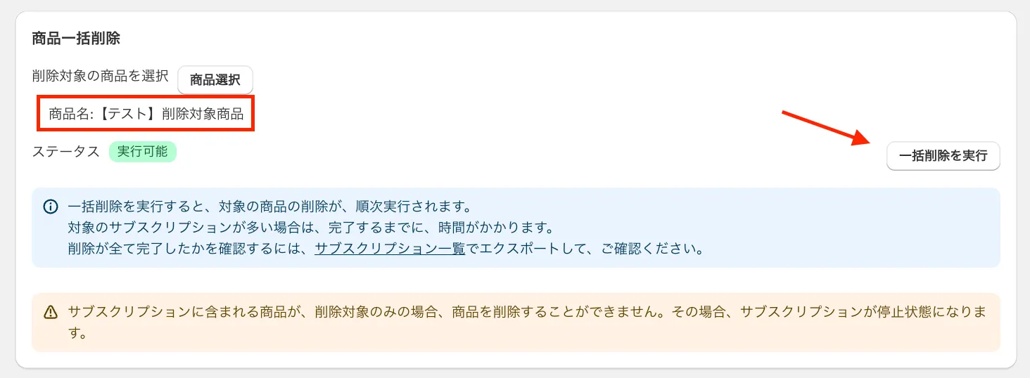 サブスクリプション契約に含まれる商品が、削除対象のみの場合、商品を削除することができません。その場合、サブスクリプションが停止状態になります。