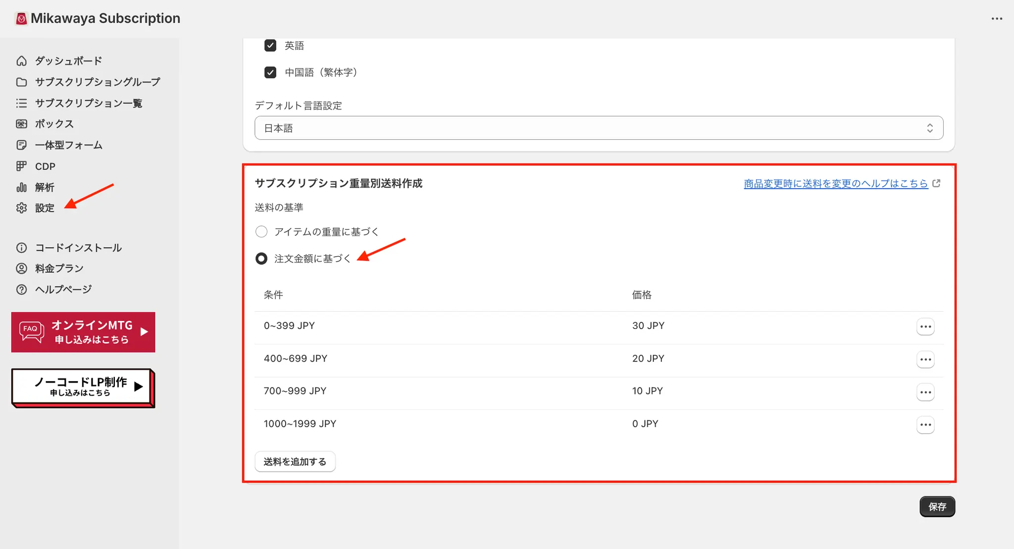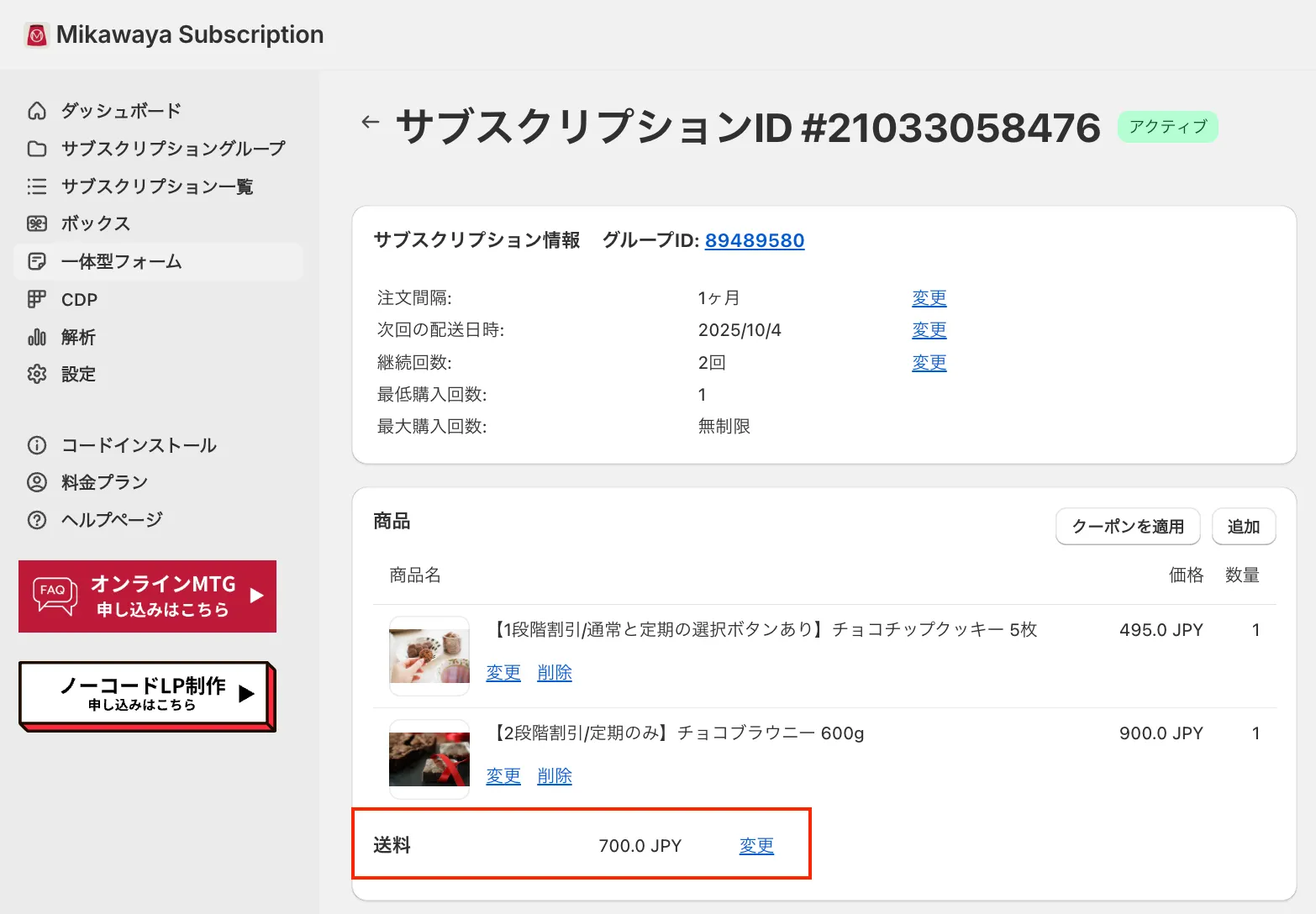 Mikawayaアプリ管理画面>サブスクリプション一覧より、送料を変更されますと、マイページ上での送料も切り替わります。