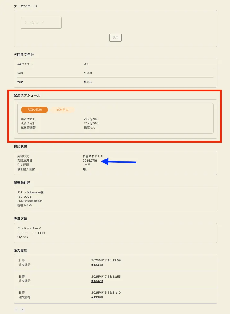 2025/10/16 - 仕様変更(サブスクリプションマイページ×解約ステータスの場合、配送スケジュールと次回決済日を非表示)