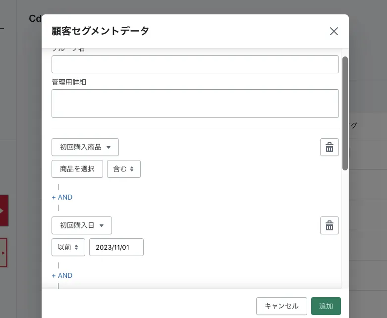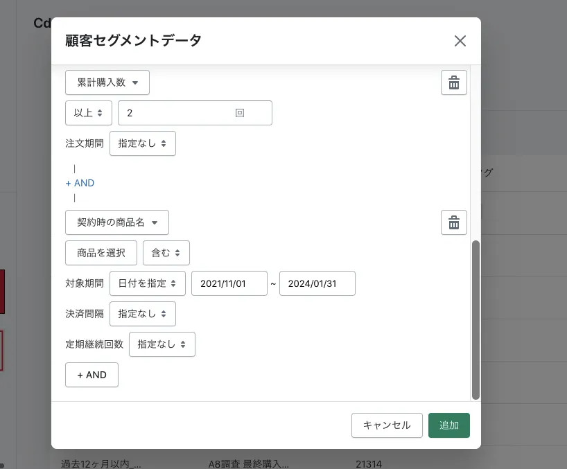 セグメント:「初回購入日」を選択し、対象にしたい期間を選択する