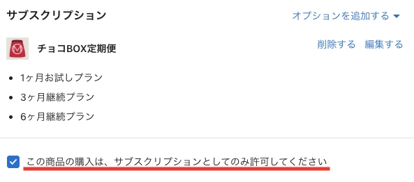 -サブスク商品のみ表示させたい場合は「この商品の購入は、サブスクリプションとしてのみ許可してください」にチェックを入れる