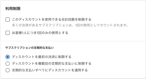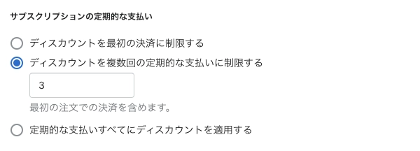 ・Shopifyクーポンコード>利用制限>ディスカウントを複数回の定期的な支払いに制限するで「2」を選択する