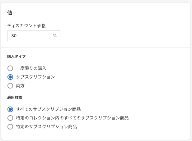 ※特定の商品だけ割引を適用させたい方は「特定のサブスクリプション商品」にチェックを入れてください。特定の商品のみ割引を適用すると、その後Mikawayaアプリ上で商品変更ができない仕様となってしまいますのでご注意ください。