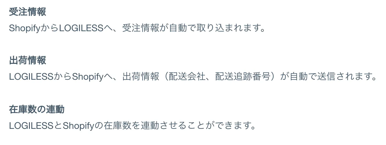 ●LOGILESSとShopifyのAPI連携を有効にした場合、その設定に応じて右の3つの項目を自動的に連携できます。