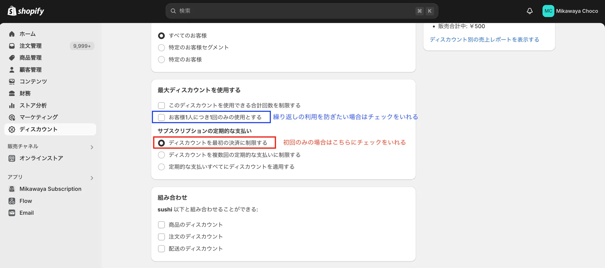 クーポン利用で、1回のみ割引を適応させたい場合は下記の設定が必要です。