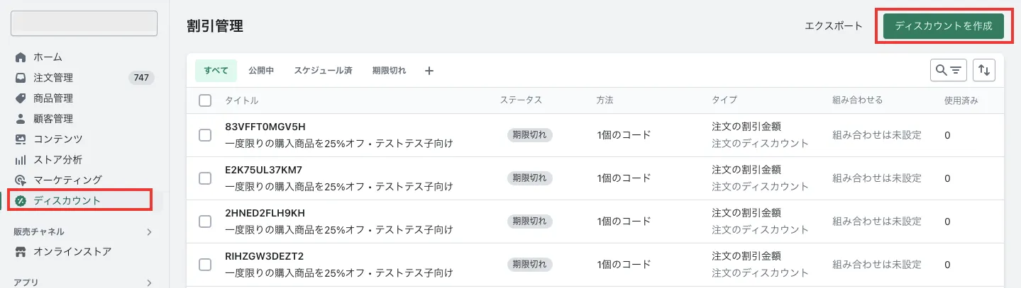 Shopify管理画面「ディスカウント」>「ディスカウントを作成」からクーポンを発行できます。