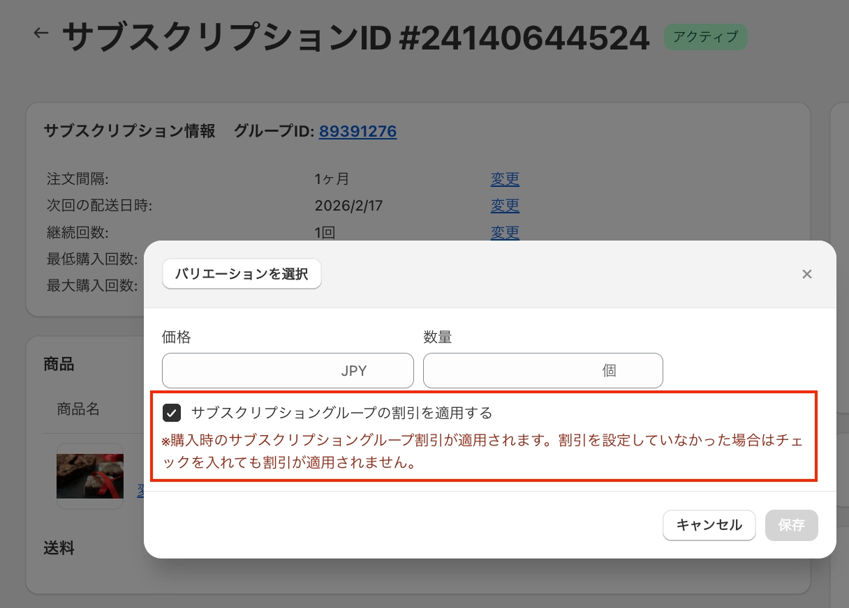 Mikawayaアプリ管理画面>サブスクリプション一覧で、継続回数を手動で変更されましても、3段階割引が連動されません。(※一度でも継続回数の変更を行うと3段階割引の情報が引き継がれず、実際にShopify注文管理で発生した注文数と連動する仕様です)