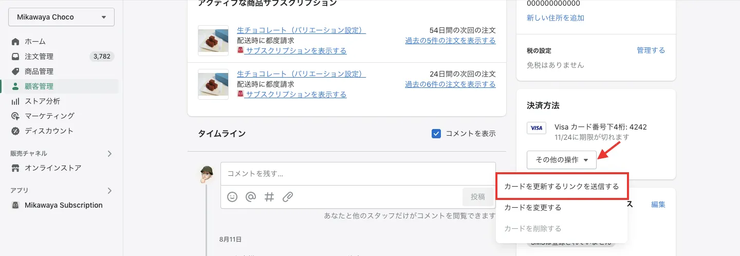 Shopify顧客管理にて「その他の操作」>「カードを更新するリンクを送信する」をクリックします。