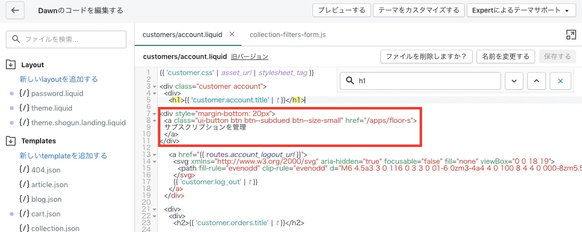 <h1>{{ 'customer.account.title' | t }}</h1> の直下に設置することをオススメいたします。