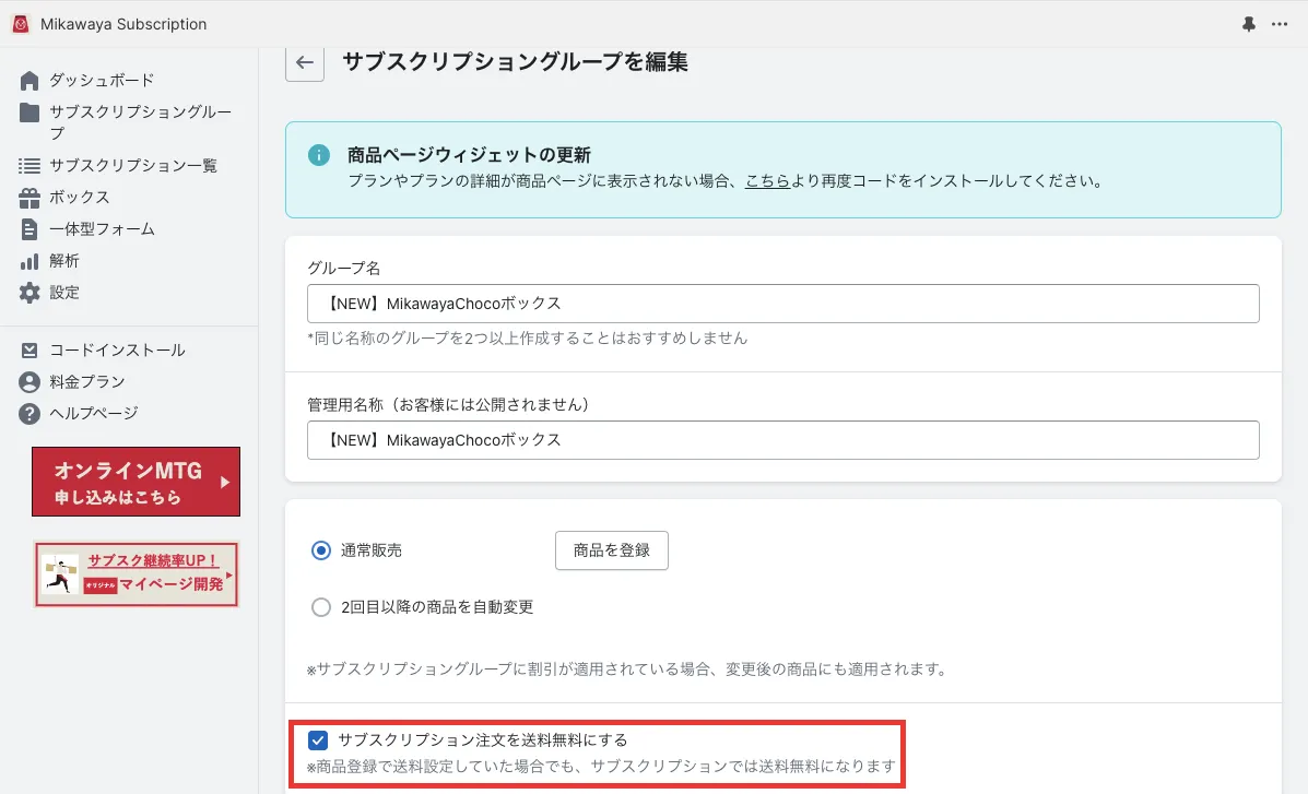 Mikawayaアプリ>サブスクリプショングループにてサブスクリプション注文を送料無料にするにレ点が入っているかご確認ください。