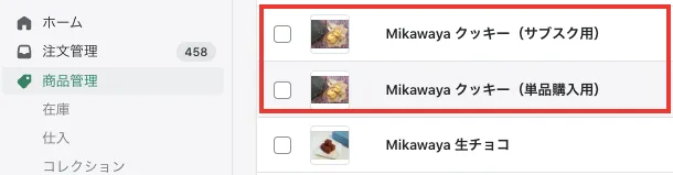 Shopify商品管理でサブスク商品と単品商品の2つを作成いただく必要があります。