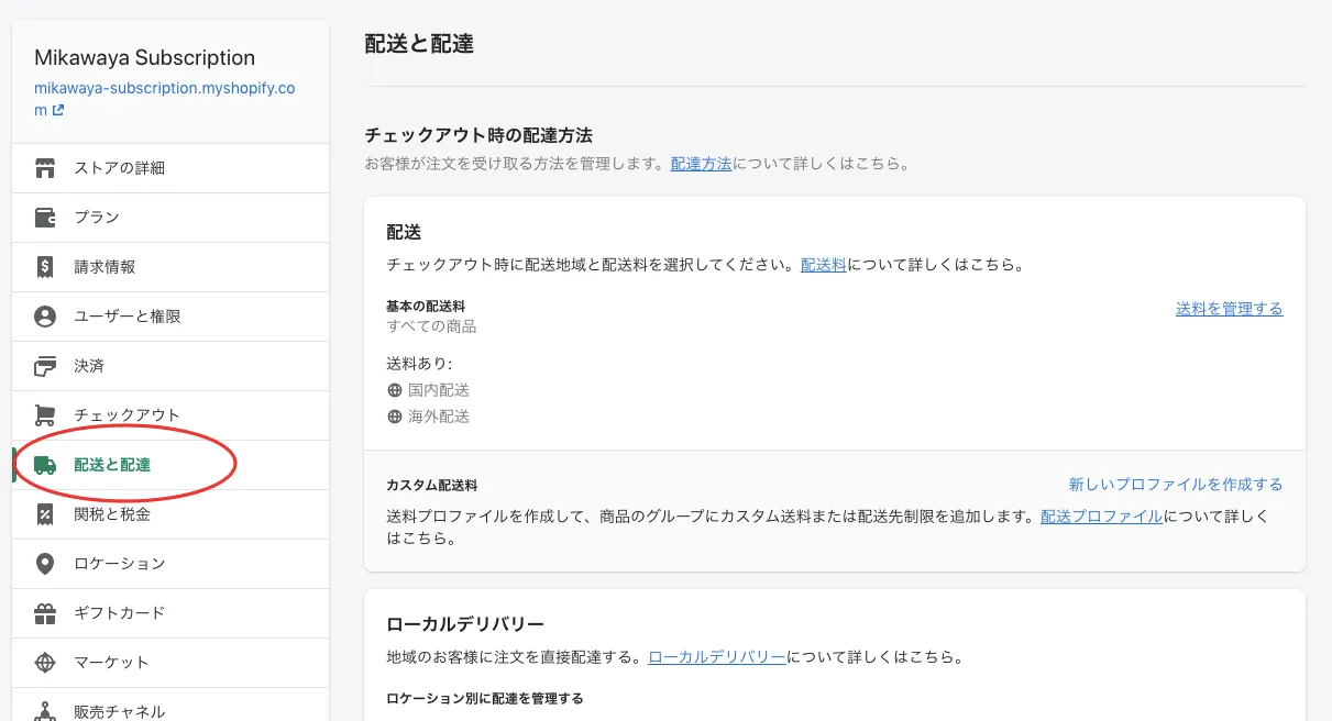 ①Shopify設定>「配送と配達」の設定は完了しているか