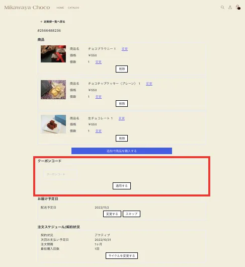 -これまでは初回購入時のチェックアウトのみしかShopifyクーポンは使えませんでしたが、今後はMikawayaマイページ(サブスクリプションマイページ)からも使用可能になりました。