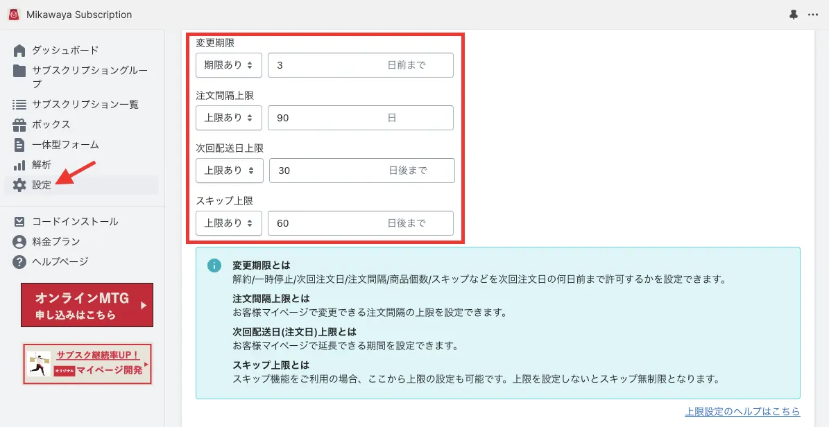 次回注文日の◯日前までに、解約や一時停止などを許可するか決めることが可能で、直前解約などを防ぐことができます。