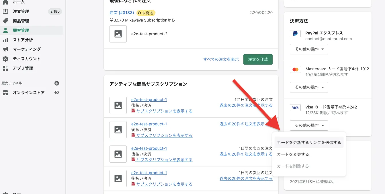 Shop Pay決済方法を利用中の場合は、下記手順で支払い方法をお客様に変更いただく必要があります。