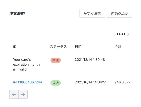 決済が失敗した場合、注文履歴を見ることで決済が失敗したタイミングを確認できます。