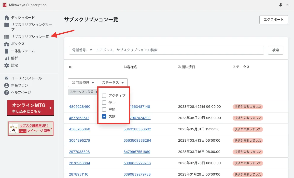 ①Mikawaya管理画面>サブスクリプション一覧>ステータスにて「決済失敗」のお客様のみ絞り込みも可能