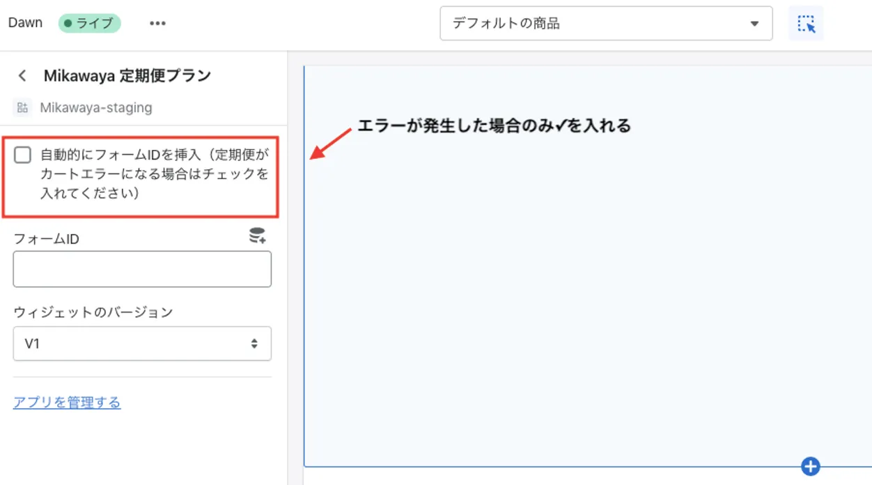 また、無料テーマをご利用の場合やエラーが発生する場合は、アプリブロック「Mikawaya定期便プラン」内にある自動的にフォームIDを挿入に✓をいれてから保存してください。