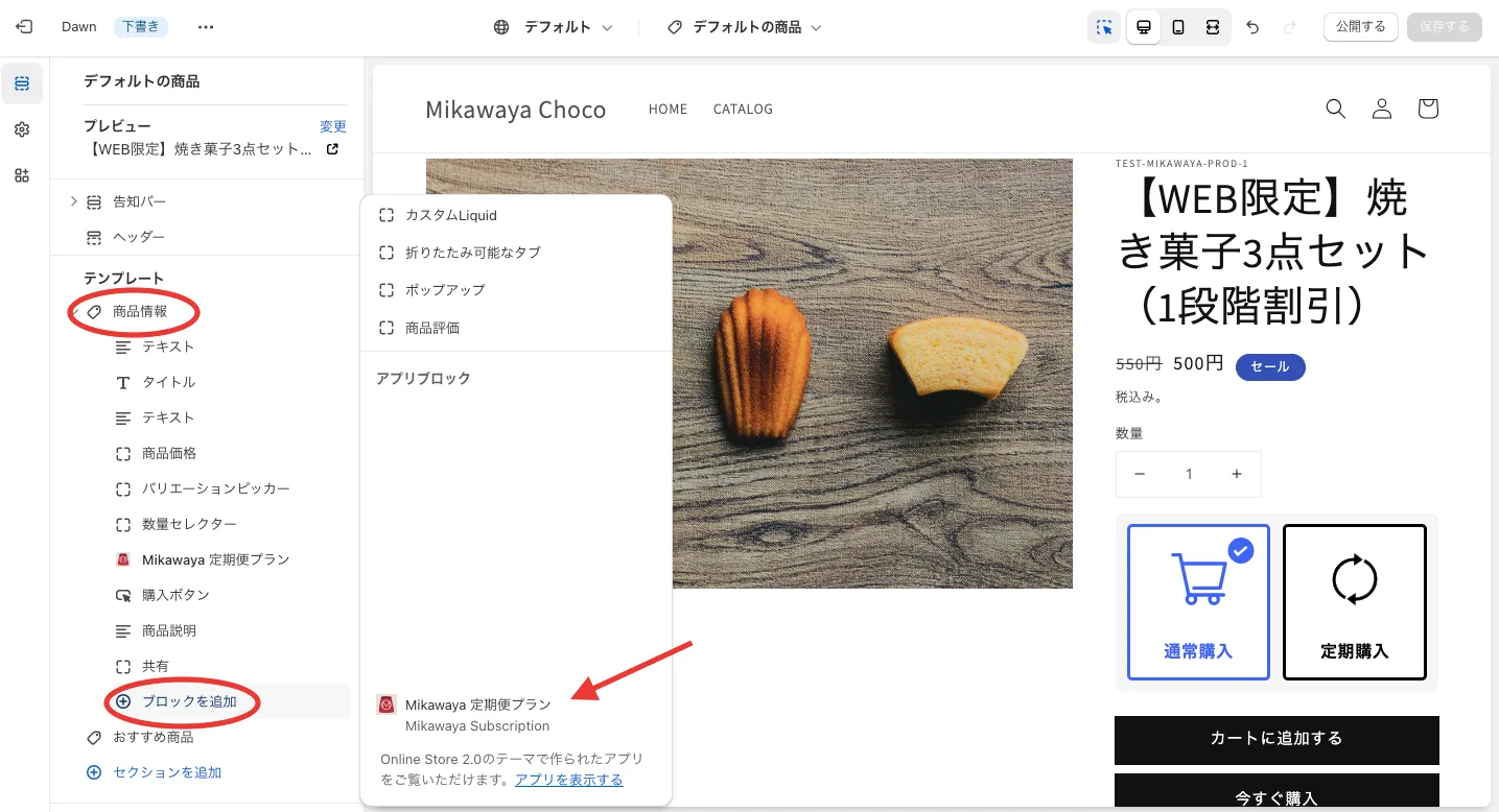 テーマとアプリの仕様により、サブスク商品の注文は直接ストアトップから買い物かごに入れる事はできないようになっております。