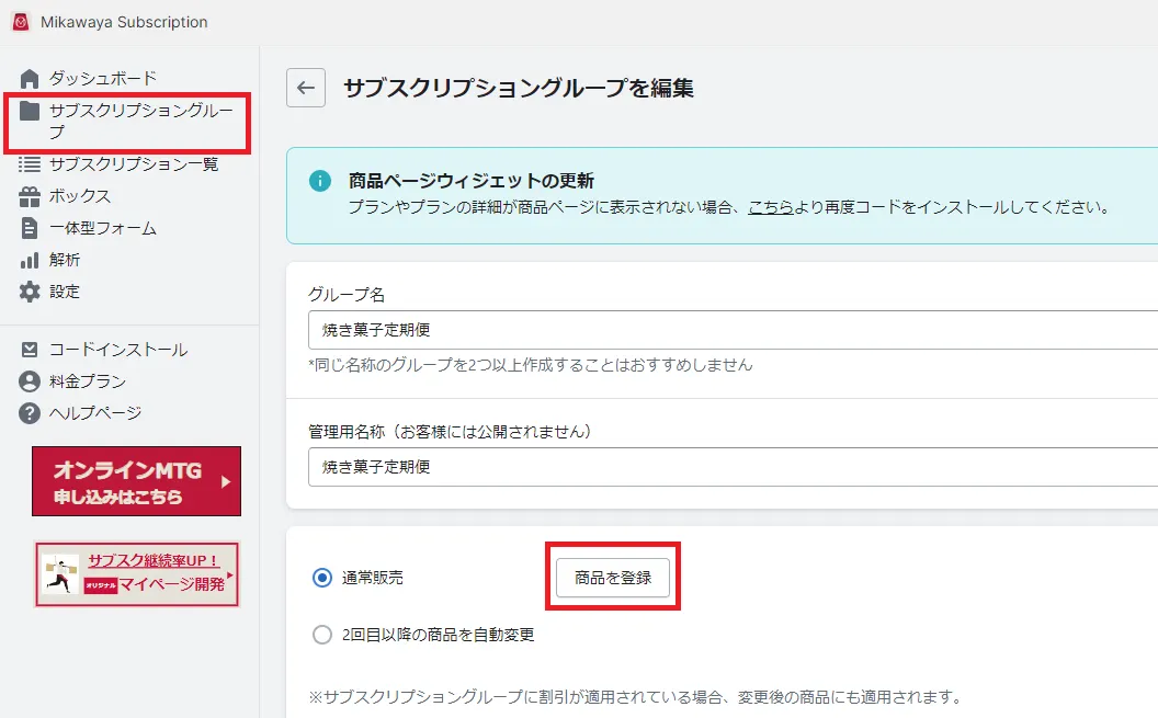 Mikawaya>サブスクリプション>商品を登録にて、対象の商品が紐づけできていない場合、『バリエーションは販売プランでのみ購入できます。』という表示がでてきます。
