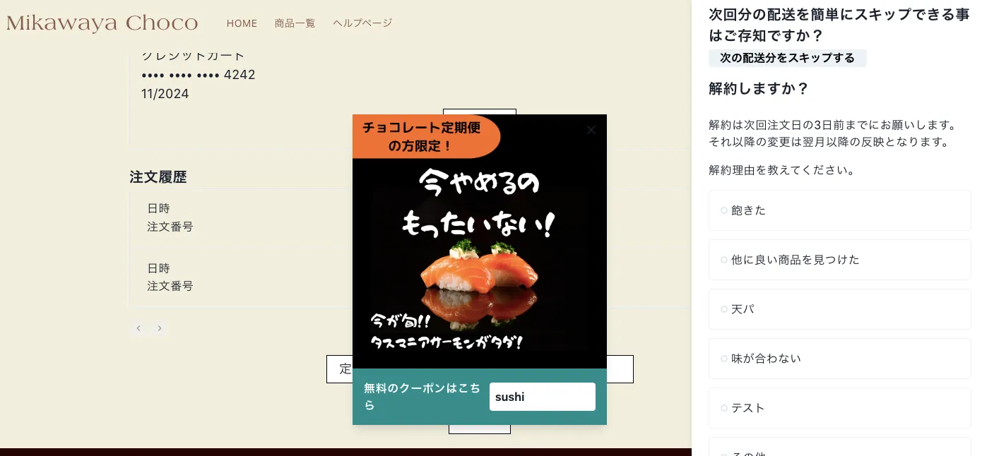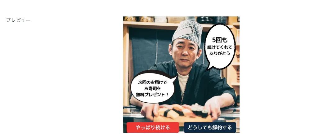 継続回数(タグ)や限定商品など、キャンペーンやセールスを意識した阻止バナーを提示することで定期便の継続率を上げることが可能。