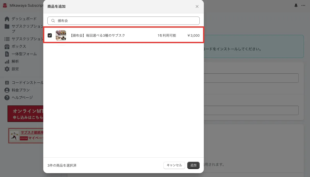 3.Mikawayaアプリ>サブスクリプショングループから商品の「頒布会」と紐づけを行う