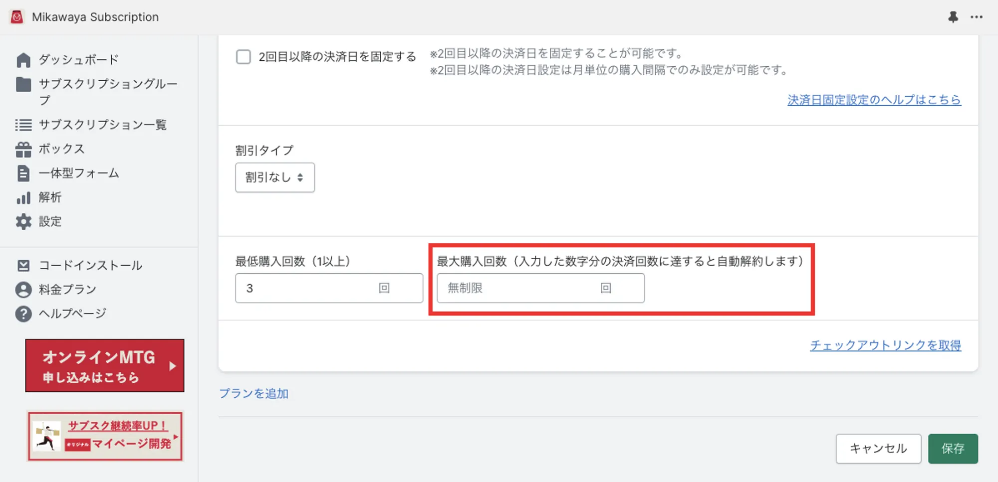 例:1カ月に1回購入で、合計12回購入したら自動定期に解約する場合は、最大購入回数を「12」と設定頂ければ自動的に解約を行うことが可能です。