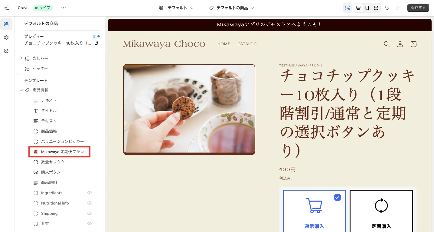 Shopifyのテーマカスタマイズ画面から、Mikawayaのアプリブロックを選択すると編集画面を確認できます