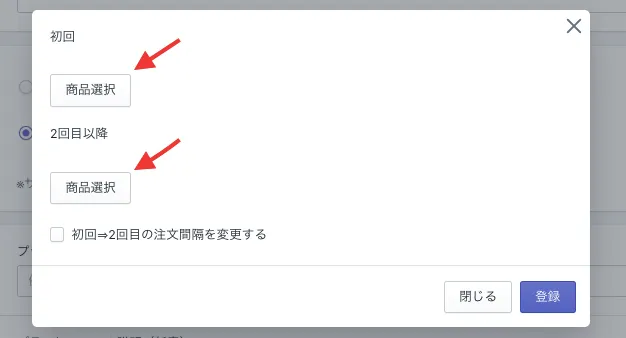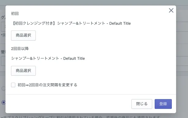 サブスクリプショングループ>2回目以降の商品を自動変更の横にある「初回と2回目の商品を登録」をクリックします。