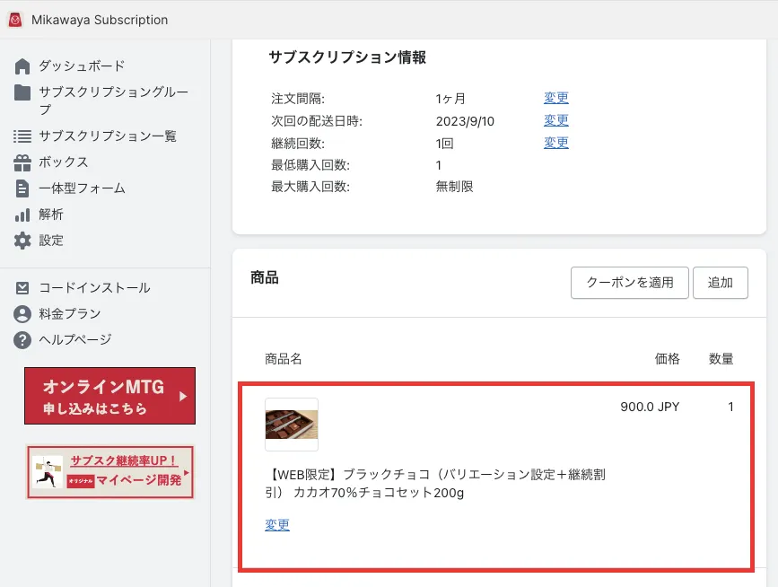 「初回⇛2回目の注文間隔を変更する」を設定されている場合、Mikawaya>サブスクリプション一覧の次回決済日が切り替わるまで、少々反映にお時間をいただく場合がございます