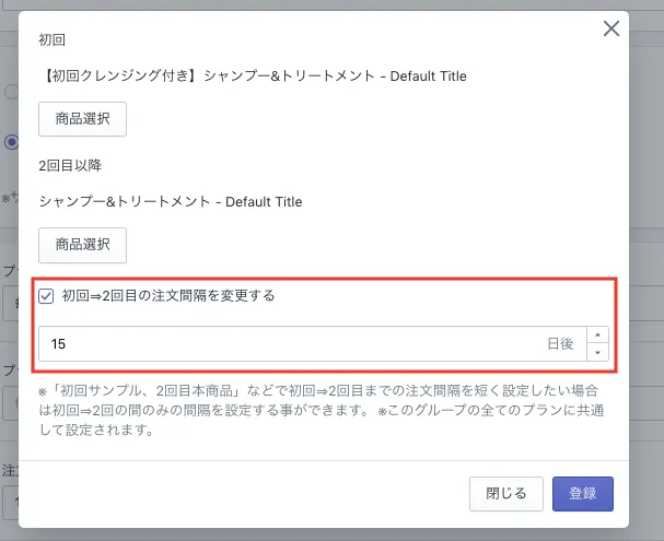 「初回⇛2回目の注文間隔を変更する」では、初回購入日を含まないで計算します