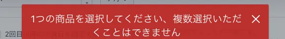 商品登録では複数商品をお選びいただくことは出来かねます(選んだ場合は以下のポップアップが表示されます)