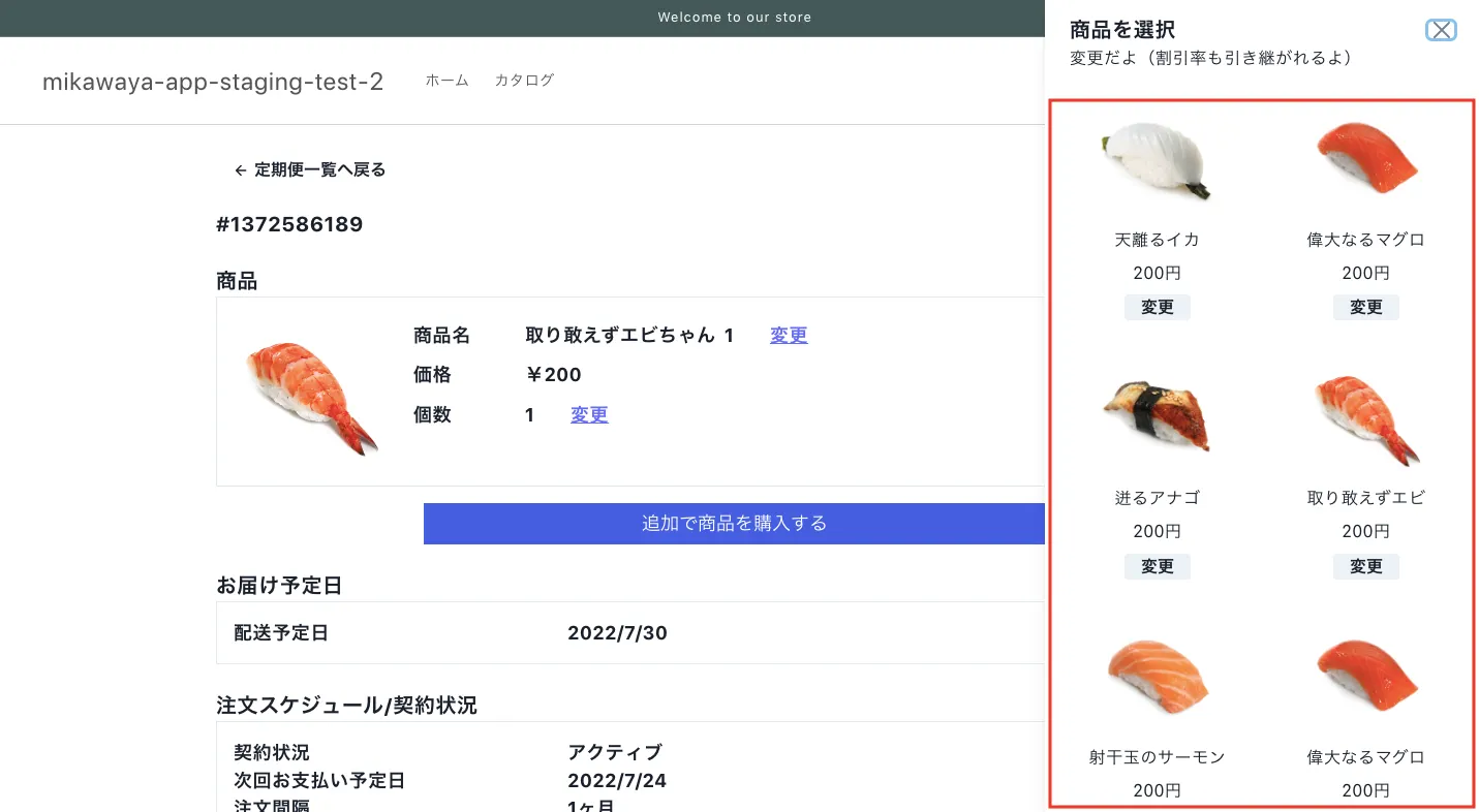 ②の場合、サブスクリプショングループ内の情報を一度"更新"(一時的にグループ管理名を変えるなど)していただくことで、商品変更モーダルに商品が表示されるようになるかと存じます。