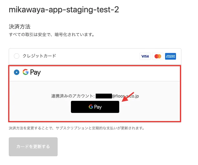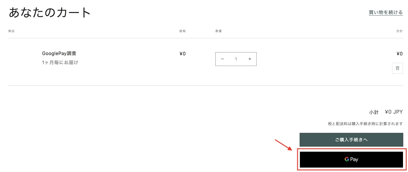 ShopifyのGoogle Pay設定を行えばサブスクリプション商品のカートページなどにGoogle Payボタンが表示されるようになるので、Mikawayaアプリ側での設定などは特に必要ありません。(※Shopify設定>決済にて設定可能)