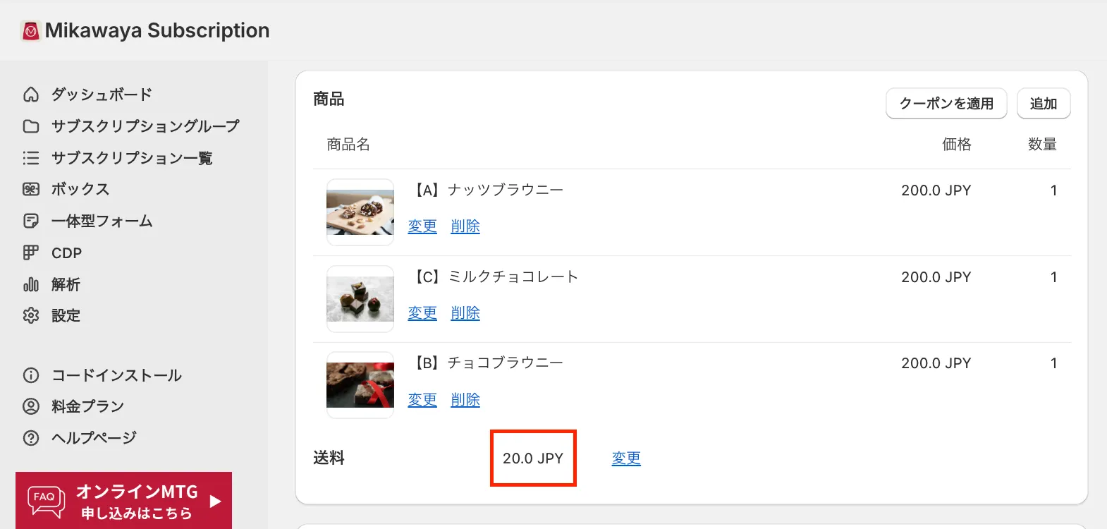 マイページ/アプリ管理画面、どちらから「商品変更」「数量変更」を実施いただいても、アプリ側に正しい送料が即時反映されます。