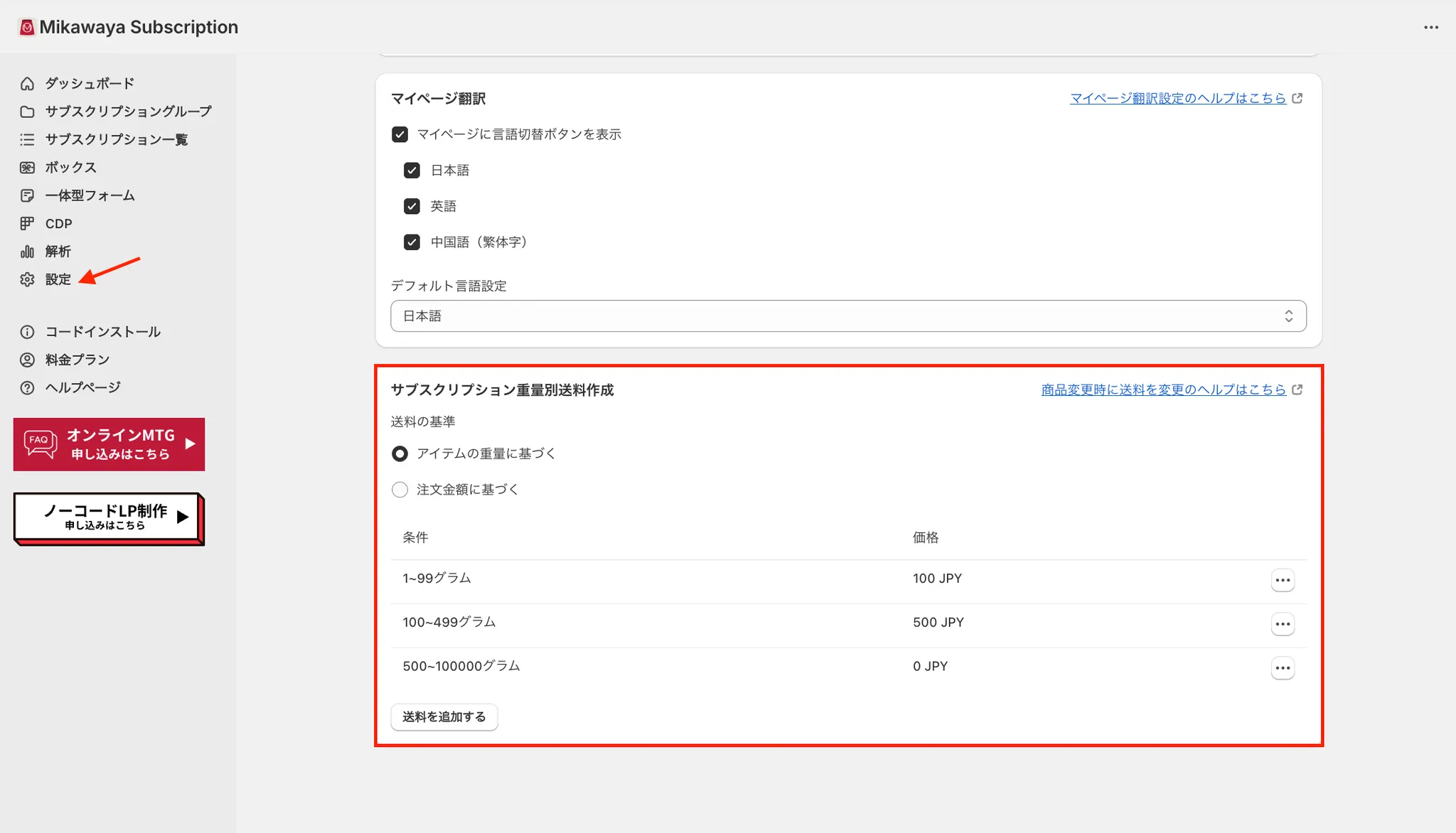 Mikawayaの「設定」の一番下に「サブスクリプション重量別送料」セクションが表示されています。