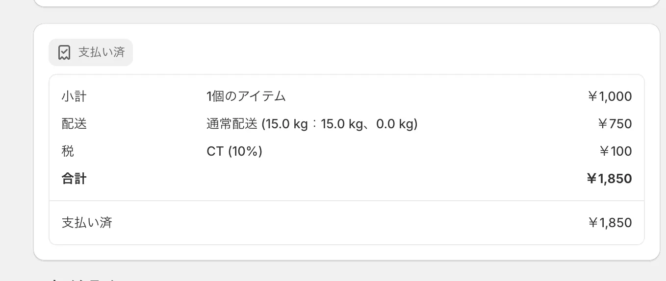 下記の例では、15kgの商品に変更した所、設定していた750円で決済がされました。