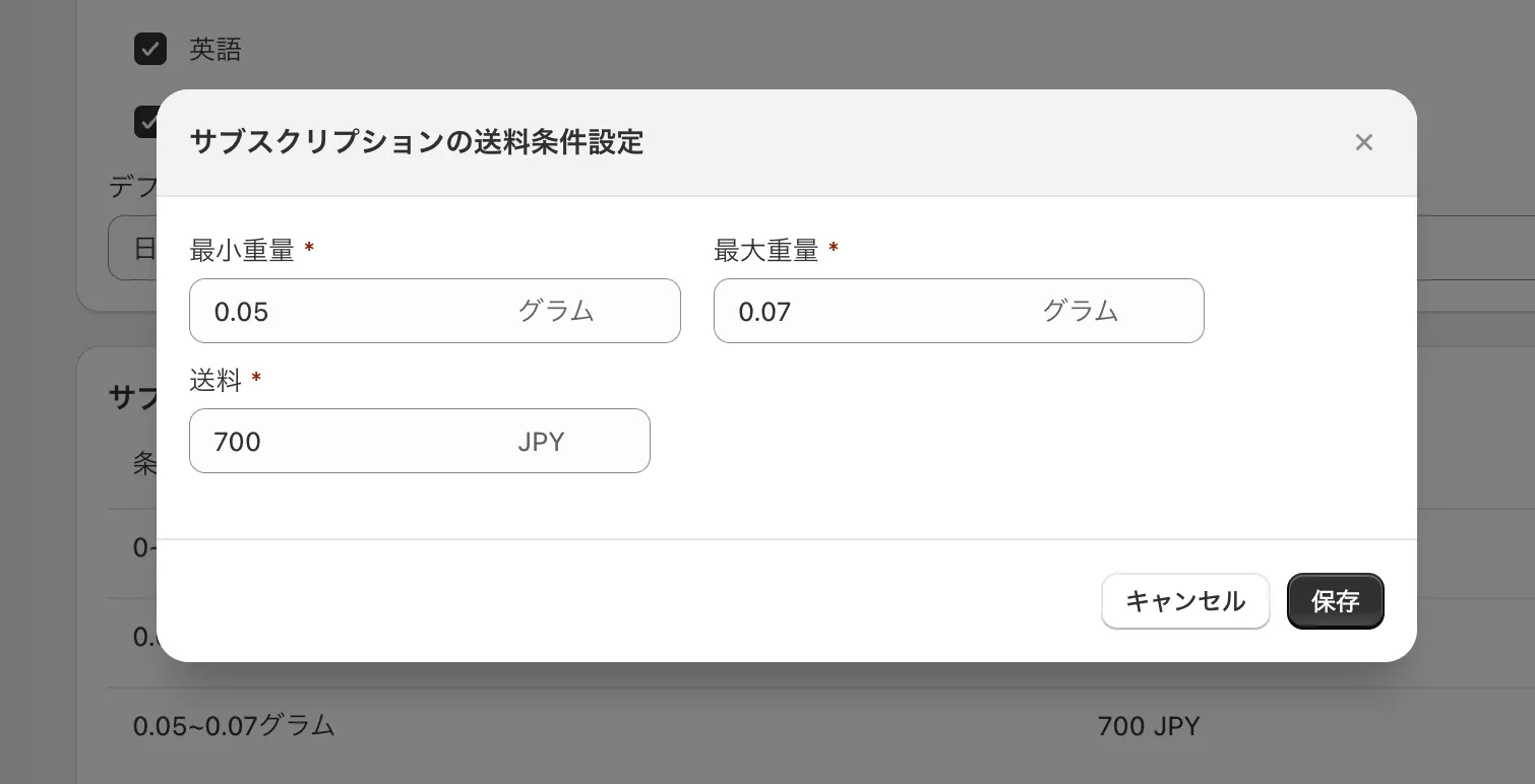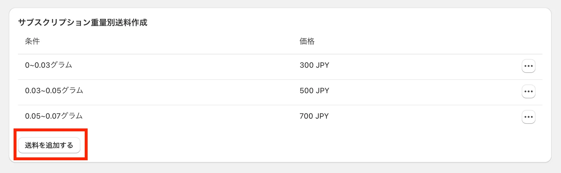 2、Mikawayaの「設定」のサブスクリプション重量別送料で「送料を追加する」ボタンで新規送料を追加できます。