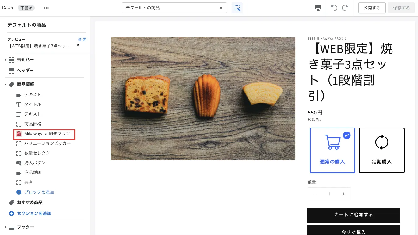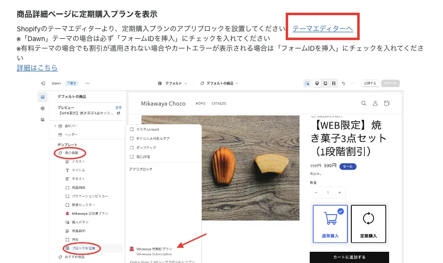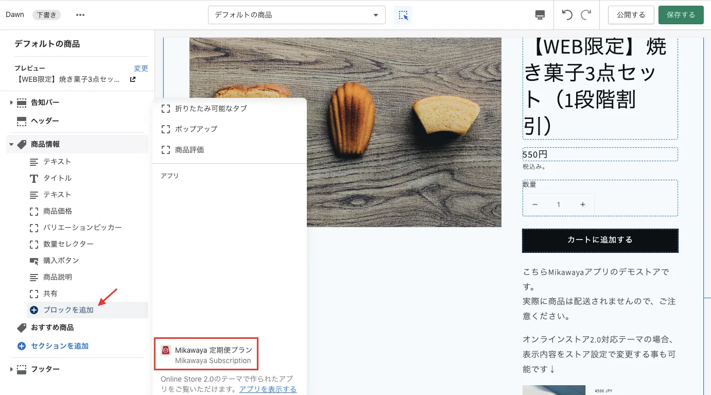 【手順③】Shopifyカスタマイズ画面>デフォルトの商品で+ブロックを追加をクリックし、「Mikawaya 定期便プラン」というアプリブロックを設定します